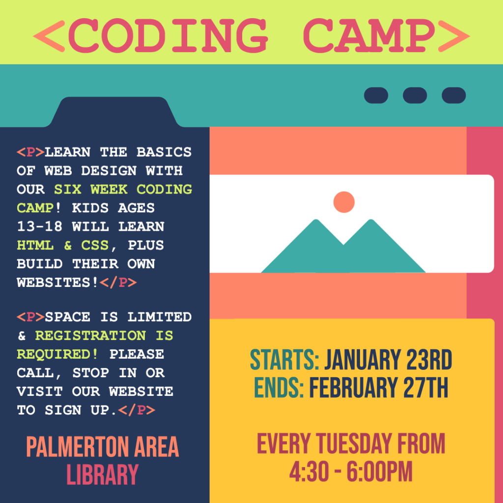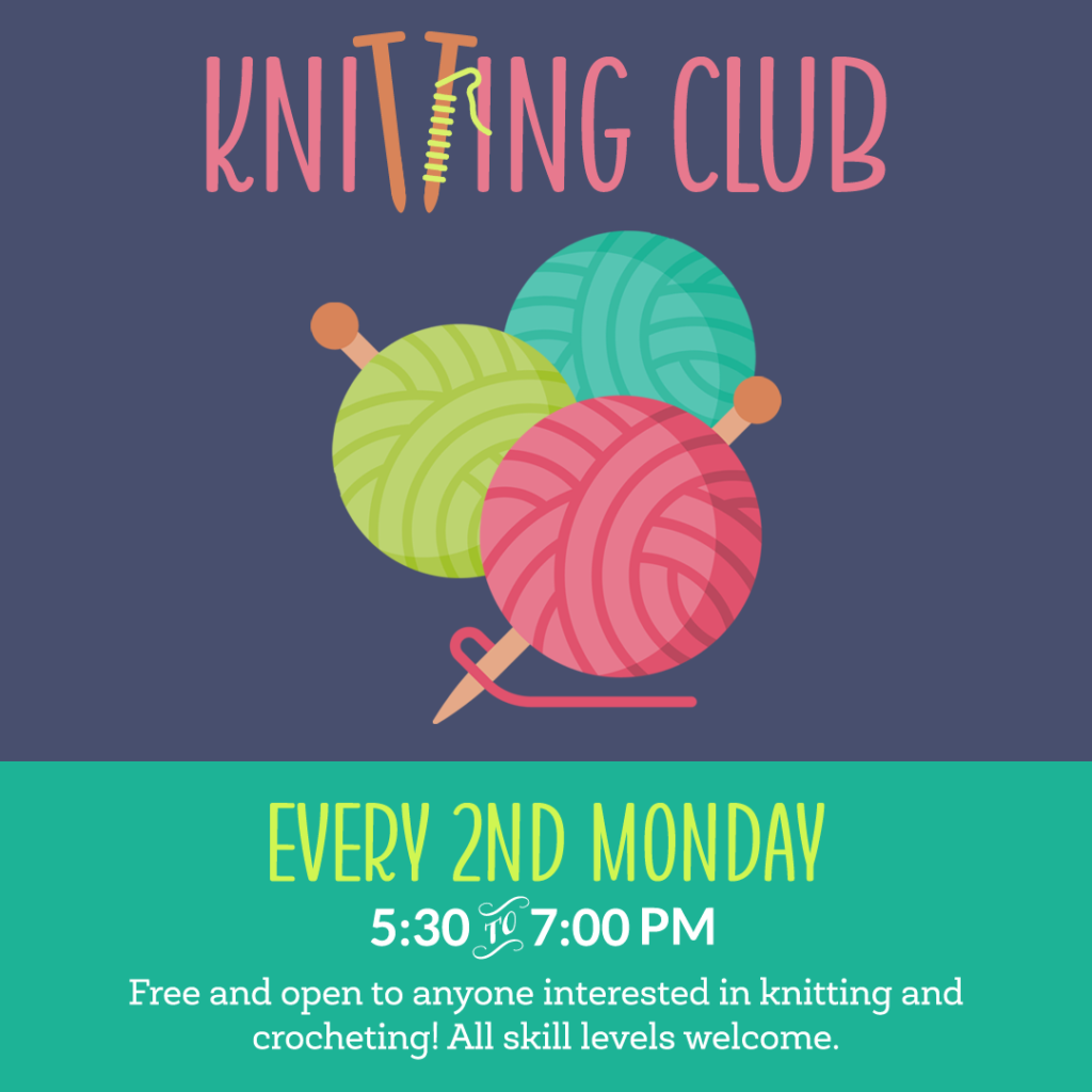 The library employs a combination of online and in-person marketing to advertise upcoming programs to the community. These graphics are designed for use digitally on social media, as well as printed flyers for the library’s bulletin boards, windows, etc. The library strives to engage as many members of the community as possible, so bright colors and cheerful imagery are used to convey a sense of warmth and welcoming.